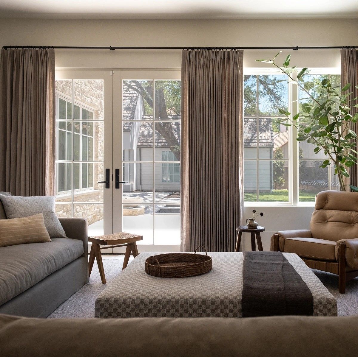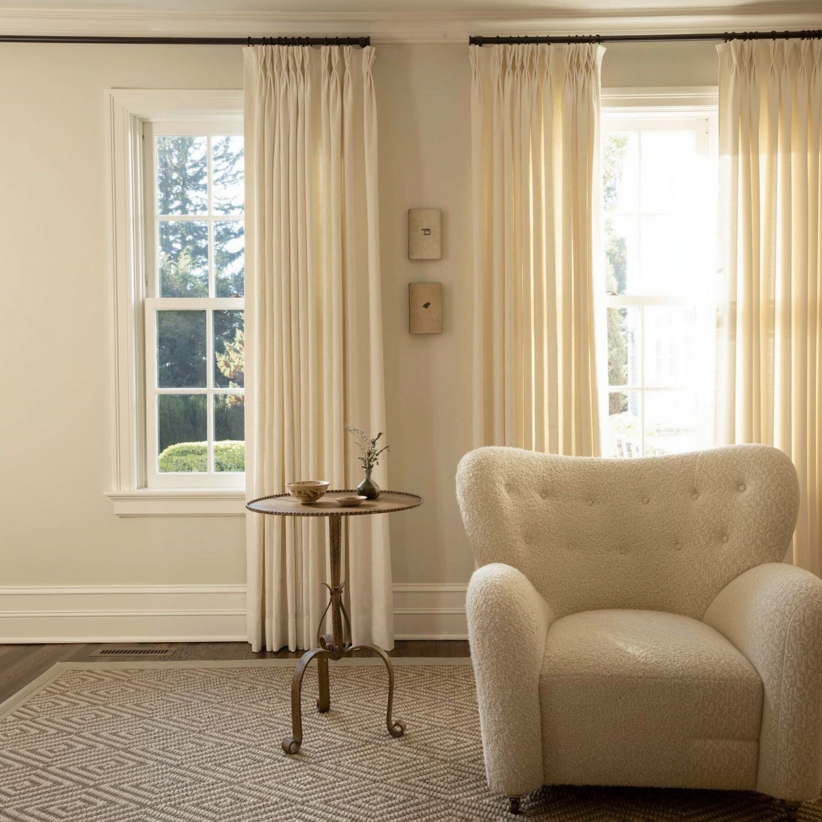 INOUTZCURTAIN Lia Linen Curtains — Luxury linen blend with classic pinch pleat design. Instantly enhance the home atmosphere, bringing warm, calm neutral textures to any space, showcasing exquisite style.